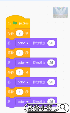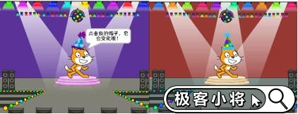 魔術(shù)師小貓的帽子可以變化四次,同時(shí)舞臺(tái)的燈光顏色也變化四次。