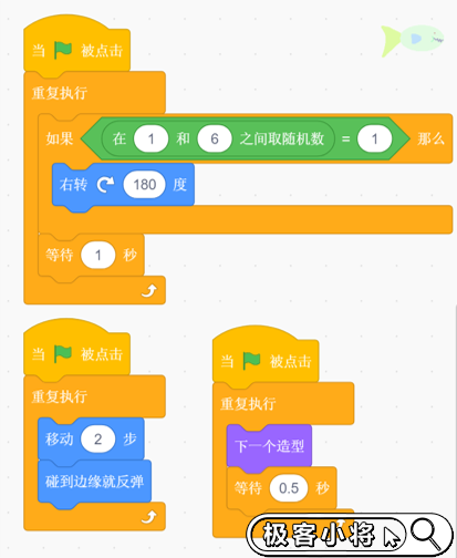 ①點擊綠旗后,小魚游來游去,碰到邊緣就反彈