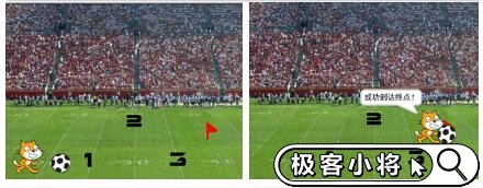 球場上有三個標記和一個終點紅旗標記,小貓需要把球依次踢到標記位置,最后把球踢到紅旗位置。