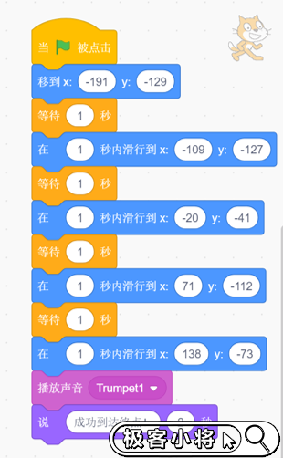 場景介紹:球場上有三個標記和一個終點紅旗標記,小貓需要把球依次踢到標記位置,最后把球踢到紅旗位置。知識點:①滑行積木的應用②滑行和移動積木的區別評價點:①點擊綠旗后,球先滑行到標記,小貓隨后滑行到②到達終點后,小貓說一句話,并播放聲音特效拓展練習:加入一個