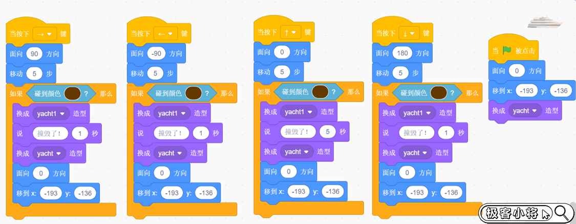 場景介紹:通過鍵盤按鍵控制輪船沿著航道標記行駛,如果撞到航道邊緣,輪船會撞毀。知識點:①鍵盤事件②偵測碰到顏色③角色位置、方向、造型初始化評價點:①點擊綠旗后,船出現在起始②上、下、左、右鍵可以控制輪船向相對性方向移動③碰到邊緣,撞毀,并回到起始位置拓展練