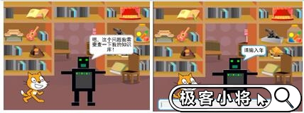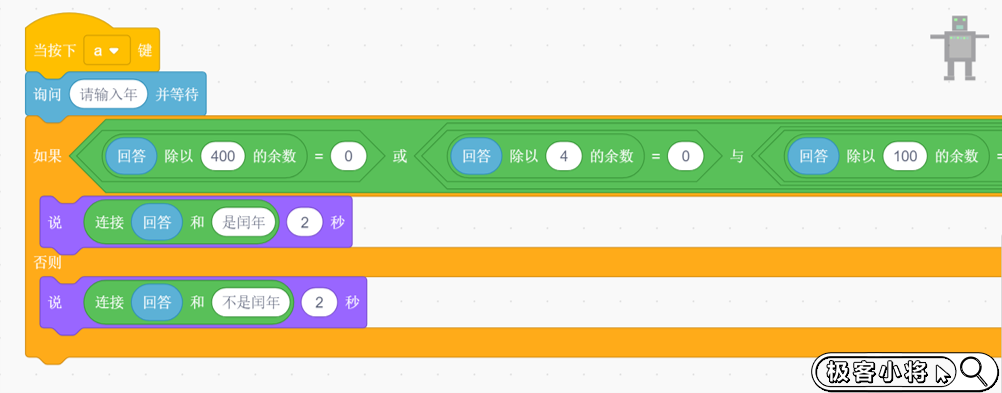 場景介紹:機器人告訴小貓閏年的由來,機器人還能計算出某一年是不是閏年。知識點:①詢問積木的應用②邏輯運算積木的應用評價點:①點擊綠旗后,機器人講述閏年的來歷②輸入年,機器人能正確說出是不是閏年拓展練習:修改故事場景,如果小貓的生日是2月29日,計算它從出生到