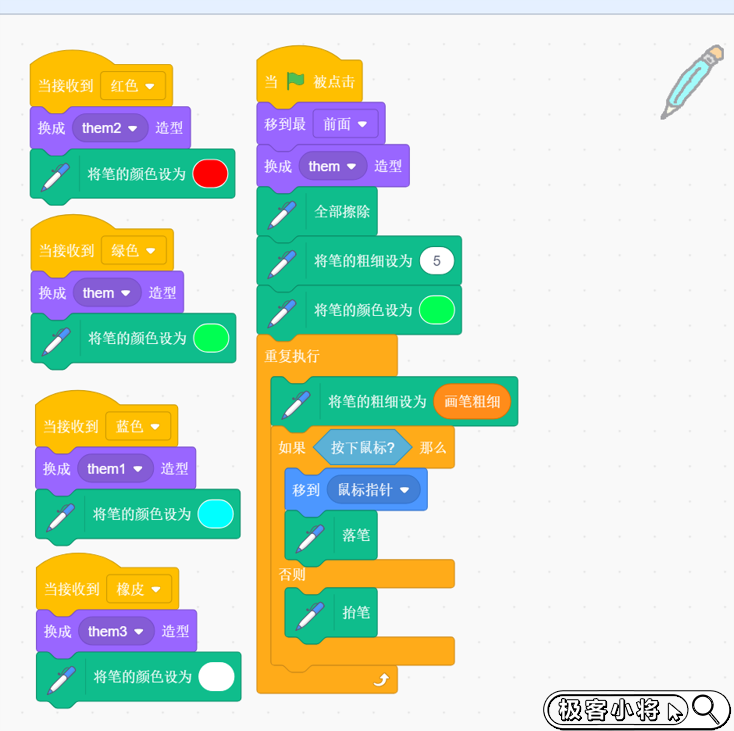 場景介紹:當按下鼠標時,畫出線段,可以選擇顏色和橡皮擦,設置畫筆粗細和清空畫板。知識點:①設置畫筆顏色②設置畫筆粗細③清空④廣播消息評價點:①點擊顏色,畫筆變化造型,線段顏色變化②選擇橡皮擦,可以擦除線段③可以清空屏幕④可以設置畫筆粗細拓展練習:①增加更多