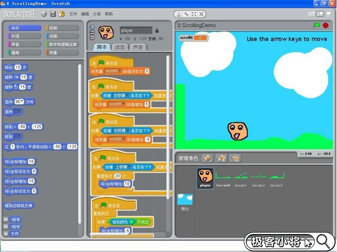 33 學(xué)生一定玩過(guò)超級(jí)瑪麗 s游戲瑪麗跳上跳下越過(guò)各種障礙,最終到達(dá)了目的地Scratch里也有類似的游戲例子請(qǐng)看一看:老師打開“Games”文件夾中第8個(gè)“ScrollingDemo”比如藍(lán)天白云下出現(xiàn)一張可愛(ài)的娃娃臉,地上有綠色的小山峰按下一個(gè)左右鍵,寶寶就開始了緊張的旅程。這個(gè)游戲很簡(jiǎn)單,但是有很多值得我們學(xué)習(xí)的地方讓 讓我們從這個(gè)例子中學(xué)習(xí),看看我們是否能創(chuàng)造一個(gè)玩具娃娃跨越障礙的游戲。