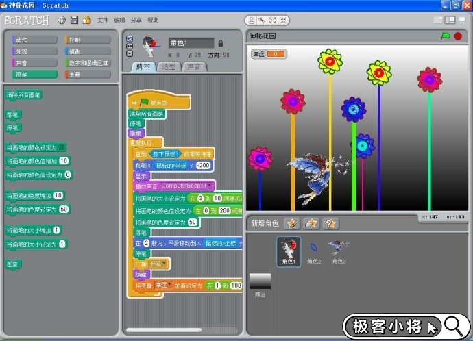 scratch有八個模塊中的一個“畫筆”類,也可以用來創作很酷的作品請欣賞老師們創作的作品-神秘花園。