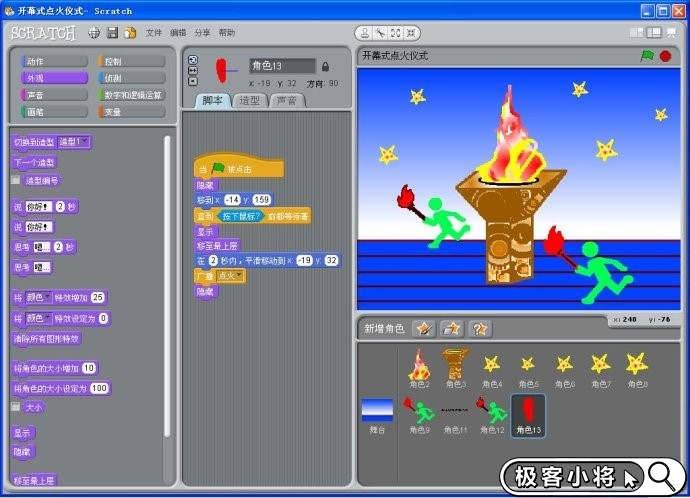 ( 1)請欣賞老師創(chuàng)作的一幅作品看,一個主火炬臺由小到大慢慢出現(xiàn)。點擊鼠標后,一團火焰自上而下緩緩移動至主火炬平臺,直至觸及主火炬然后音樂開始,閃爍的星星出現(xiàn)在天空,火焰飄揚;幾秒鐘后,音樂切換,兩名舉著火把的運動員從場邊跑進畫面。