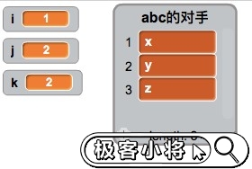 定義三個變量i 、j、k(假設(shè)a、b、c的對手分別為i 、j、k);新建列表,存入對手x,y,z,如下圖(將x,y,z分別用數(shù)字1、2、3代替),1、2、3分別對應(yīng)x、y、z。