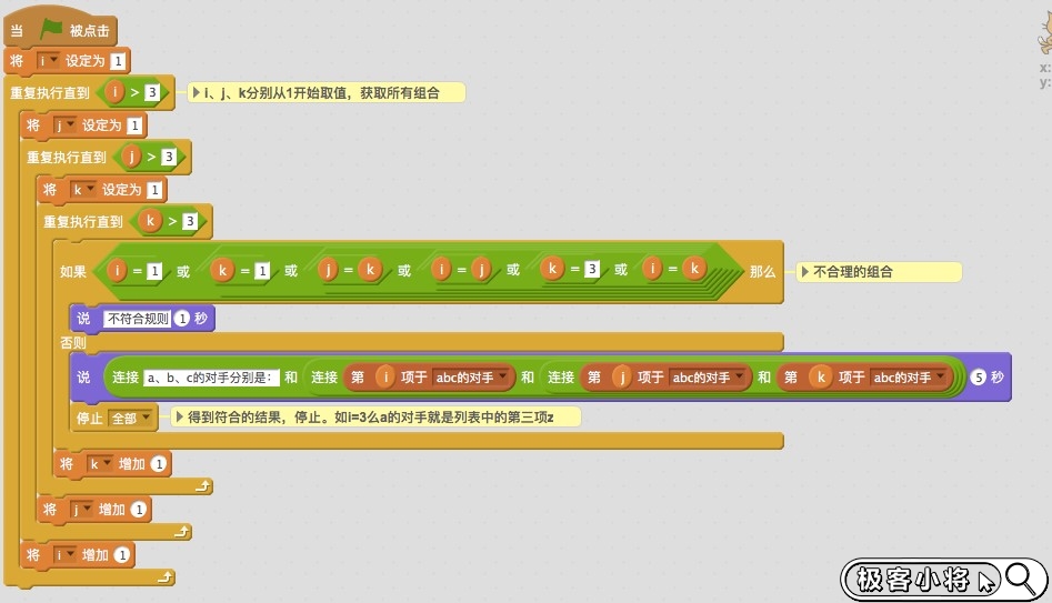具體方案如下:我們先假設(shè)a、b、c的對手分別為i 、j、k ,將x,y,z分別用數(shù)字1、2、3代替,這樣就更接近數(shù)學(xué)的方程問題了。接下來進(jìn)行各種可能的組合(i、j、k 都可以等于1、2、3),每當(dāng)?shù)玫揭唤M組合結(jié)果,進(jìn)行判斷,如果結(jié)果滿足下列條件之一,那么這組結(jié)果都是不符合的,否則就是正確的。