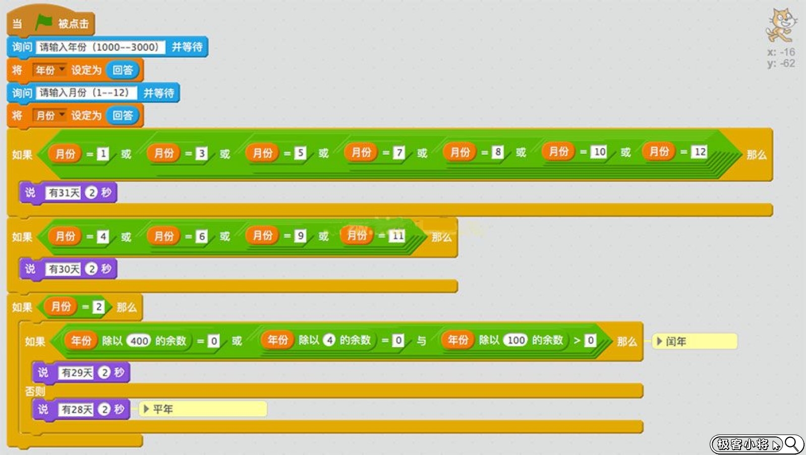 scratch算法練習-計算天數題目出自CCF計算機程序設計入門篇練習(難度:中,三年級以上)題目要求:輸入年份與月份,說出該月共有多少天。(1000<=年份<=3000,1<=月份<=12)思路:1、3、5、7、8、10、12每個月都有31天;4、6、9、11每個月都有30天;2月比較特殊,