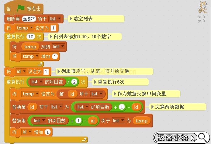 scratch算法練習-列表逆序題目:將一個列表數(shù)據(jù)逆序,如[1、2、3、4、5、6、7、8、9、10]逆序后[10、9、8、7、6、5、4、3、2、1]。分析:將列表數(shù)據(jù)前后對稱進行交換,即第一項與最后一項交換,第二項與倒數(shù)第二項交換,以此類推,總共交換列表項數(shù)/2次。如題,列表總共有n=