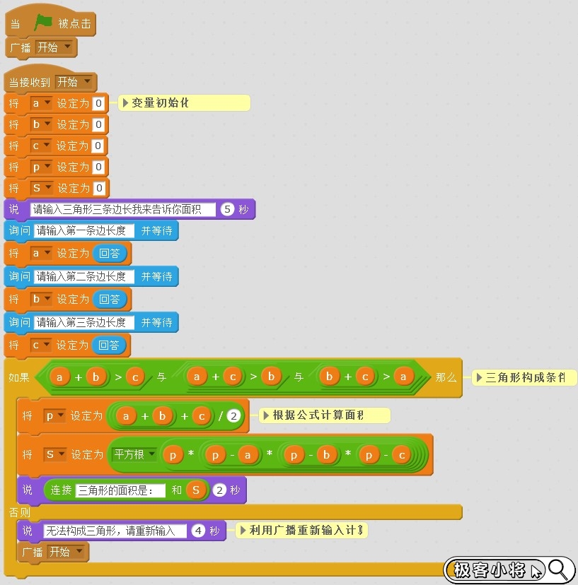 scratch算法練習-輸入三條邊計算三角形面積輸入三角形三邊長a,b,c(保證能構成三角形),輸出三角形面積。適合初中以上學生,需要平面幾何的知識,此題目來自CCF中小學程序設計練習。題目:輸入三角形三邊長a,b,c(保證能構成三角形),輸出三角形面積。基礎知識:1、構成三角