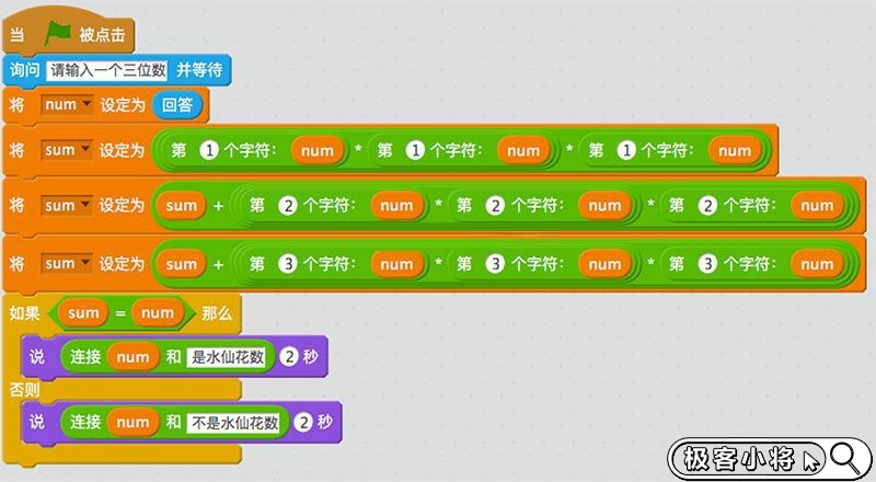 積木來將這個三位數(shù)拆開,分別計算每一位的冪,把他們加起來,與這個數(shù)比較,如果相等就是水仙花數(shù),否則不是。