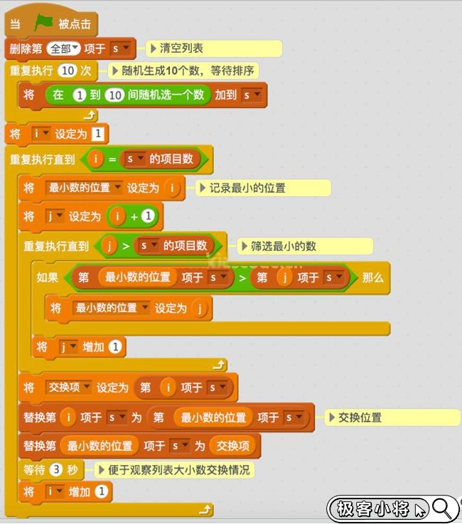 題目:使用Scratch編寫程序,對列表中的10個數(shù)利用選擇排序法排序。【不易理解,建議年齡10+】