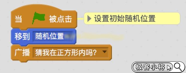 scratch算法練習-在正方形內(nèi)嗎?題目:有一個正方形,四個角的坐標分別是(90,-90),(90,90),(-90,-90),(-90,90)。編寫程序,開始運行的時候給角色設(shè)置一個隨機位置,然后判斷這個角色(角色的中心點)是否在這個正方形內(nèi)(包括正方形邊界),如果在正方形內(nèi)說“