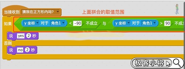 題目:有一個正方形,四個角的坐標分別是(90,-90),(90,90),(-90,-90),(-90,90)。編寫程序,開始運行的時候給角色設(shè)置一個隨機位置,然后判斷這個角色(角色的中心點)是否在這個正方形內(nèi)(包括正方形邊界),如果在正方形內(nèi)說“Yes”,否則說“No”。