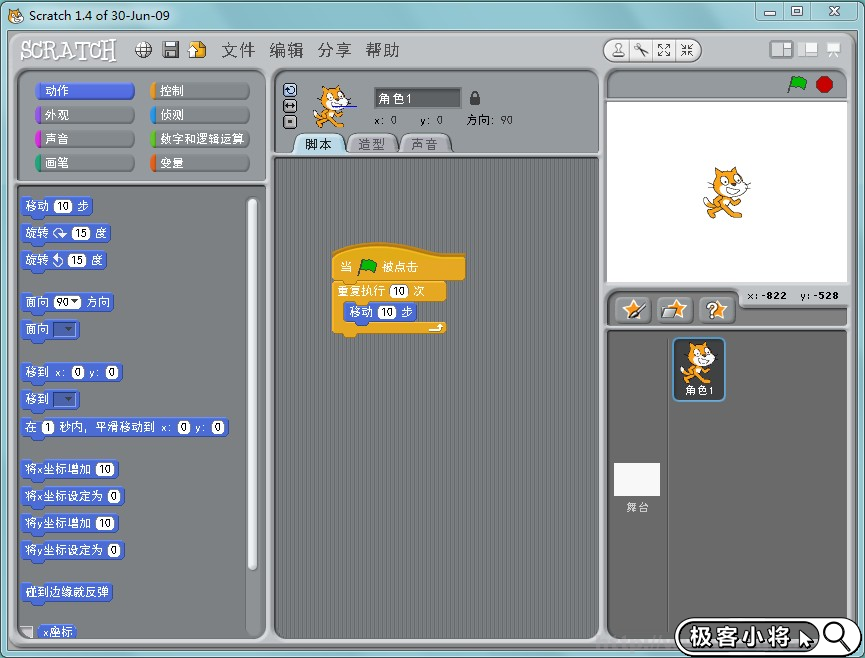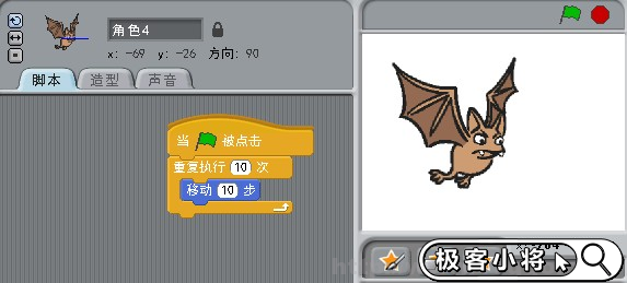首先點擊要扮演的角色,然后點擊它“腳本”,然后按命令分類選擇您想要的命令構建塊,將命令構建塊拖動到程序區,并排列順序(您可以通過用鼠標拖動來更改它的順序)