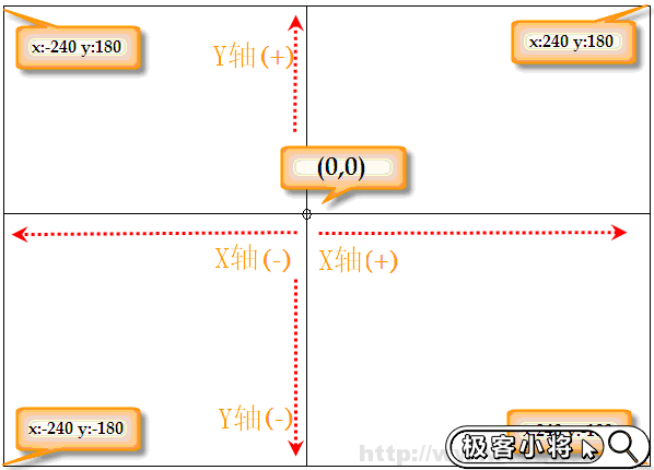 舞臺的中心是(0,0),橫軸是X軸,縱軸是Y軸。