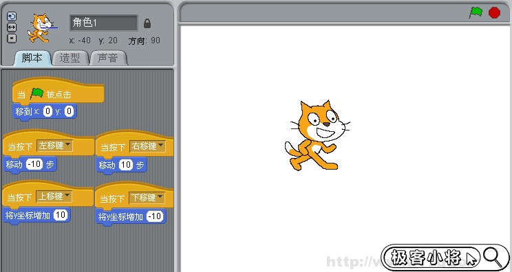 在這節(jié)課中,我們將學習通過鍵盤控制字符的移動主要目的是讓我們知道,只有事件被觸發(fā),才會有動作當按下綠色標志時,對象將首先移動到坐標(0,0)