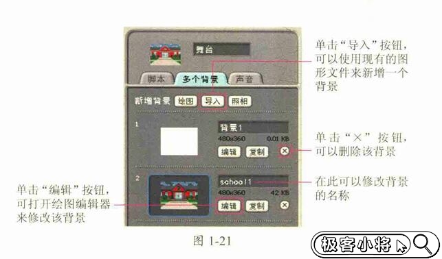 Scratch只有一個舞臺,不過我們可以為這個舞臺設置不同的背景。創(chuàng)建 一個新的項目時,舞臺背景默認是白色,我們可以使用內置的繪圖編輯器繪 制背景,也可以導入現(xiàn)成的圖形文件。 我們在角色區(qū)中用鼠標選擇左方的“舞臺”,在腳本區(qū)中選擇“背 景” 面板,單擊“導入” 按鈕,就可以新增舞臺的背景。例如在圖1-21 中,除了默認的白色背景外,我們還新增了一個學校門口(內置圖庫 Outdoors — School 1 ) 的背景。我們可以為每個背景取一個有意義的名稱,當 導入一個圖形文件時,默認會使用它的文件名作為該背景的名稱。