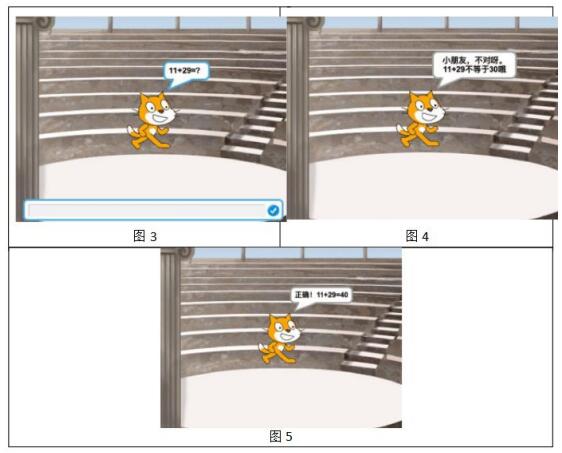 編程實現:實現加法口算練習測試 讓小貓利用步驟 1 實現的方法和過程來輸入兩個兩位整數,隨后詢問這兩個整數 所構成加法算式的計算結果,例如輸入的兩個兩位整數位“11”和“29”時的提示如 圖 3 所示。 小貓根據使用者的計算結果提示計算的結果是否正確,當結果不正確時提示如圖 4,并且在 2 秒后再次提問,當結果正確時提示如圖 5,并且程序停止運行。