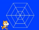 編程實現:設臵舞臺背景為藍色,選擇畫筆為白色,粗細 2,坐標(0,0)點為中心,繪制一 個如圖所示的蜘蛛網。它是三層結構,基本單元中最小的三角形邊長為 50,每向外延 伸一層,邊長增加 50。注意: 1、點擊綠旗,小貓能夠瞬間繪制出蜘蛛網圖案,中間不可停頓。 2