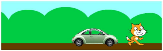 編程實現: 將舞臺背景改為如圖所示,在舞臺上設臵 1 個小車“Car-Bug”角色,并保留默 認的小貓角色。 小車從舞臺左側向右行駛。當小車快要碰到小貓時,小車能自動停止移動,而小 貓被嚇到了。 具體要求: 1、每次點擊綠旗后,初始位臵如下,小貓角色的