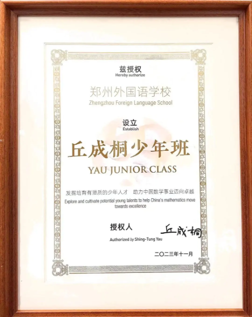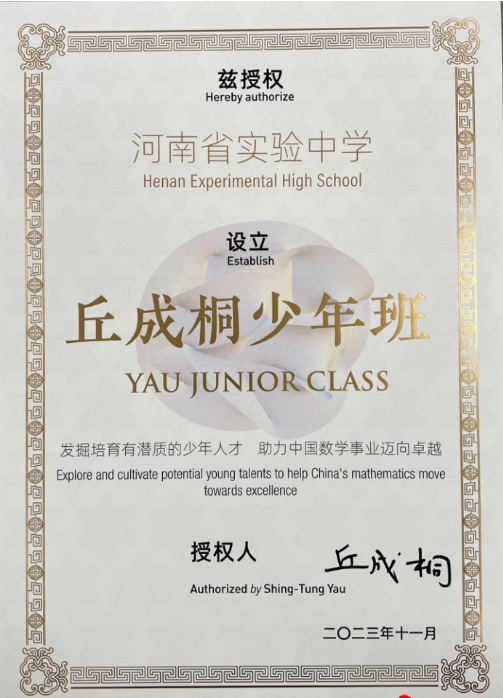 河南省教育廳關(guān)于開(kāi)設(shè)“丘成桐少年班”數(shù)理拔尖人才貫通培養(yǎng)項(xiàng)目的批復(fù)的文件,內(nèi)文提到,同意河南省實(shí)驗(yàn)中學(xué)、鄭州外國(guó)語(yǔ)學(xué)校開(kāi)設(shè)”丘成桐少年班”。