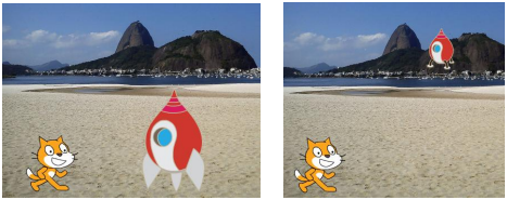 準備工作: 背景選擇“Beach Rio”,導入角色庫中火箭角色“Rocketship”。 編程實現: 1、當綠旗被點擊后,小貓和火箭出現在如圖 1 位臵(大致位臵即可)。注意:此 時火箭造型為 spaceship-a。 2、小貓說“發射火箭”2 秒后,火箭切換造型為 spa