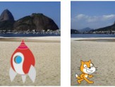 準備工作: 背景選擇“Beach Rio”,導入角色庫中火箭角色“Rocketship”。 編程實現: 1、當綠旗被點擊后,小貓和火箭出現在如圖 1 位臵(大致位臵即可)。注意:此 時火箭造型為 spaceship-a。 2、小貓說“發射火箭”2 秒后,火箭切換造型為 spa