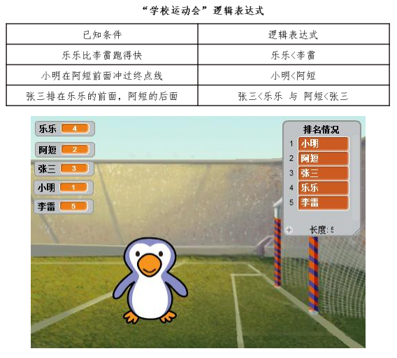 編程實現:學校運動會開賽了。阿短、張三、李雷、樂樂和小明都參加了百米賽跑。 樂樂說:“我比李雷跑得快。” 阿短說:“小明在我前面沖過了終點線。” 張三說:“我的名次排在樂樂的前面,阿短的后面。” 你能根據他們的回答,使用 Scratch 得出他們的名次么