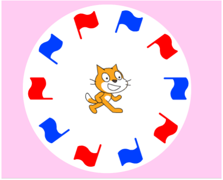 準備工作: 繪制中間為白色圓,旁邊為粉色的背景,使用默認角色。 編程實現: 小貓被彩旗包圍了,點擊綠旗。舞臺上只有背景,一秒后,小貓出現。再過一 秒,依次出現紅旗和藍旗。