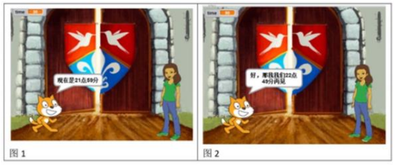 編程實現: 設臵默認角色,設臵大小為 30,位臵自擬,小貓說出當前的時間,Abby 隨機說 幾十(0-100)分鐘后見,小貓說出下次見面的具體時間。 注意: 1、時間為當前時間。 2、“Abby”說的分鐘數為隨機的分鐘數。